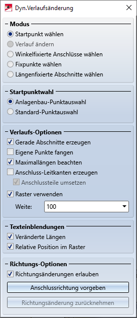Über dieses Dialogfenster lassen sich zum einen Optionen für die Auswahl des Zielpunktes ein- oder umschalten. Zum anderen finden Sie hier weitere Schaltflächen und Optionen, mit denen Sie den Verlauf beeinflussen können - beispielsweise Fixpunkte, längenfixierte Abschnitte und winkelfixierte Anschlüsse festlegen.