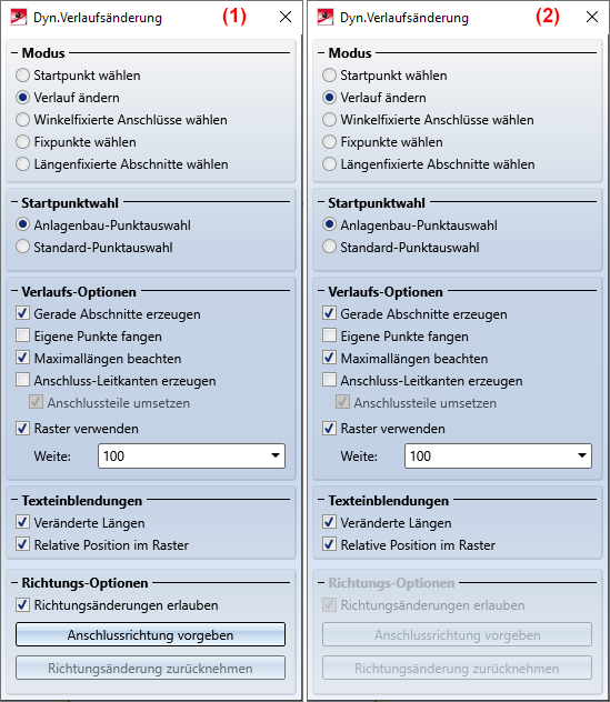 Durch Aktivieren dieser Option schalten Sie wieder in den Modus Verlaufsänderung zurück, z. B. nach der Bestimmung von Fixpunkte, winkelfixierten Anschlüssen etc. |