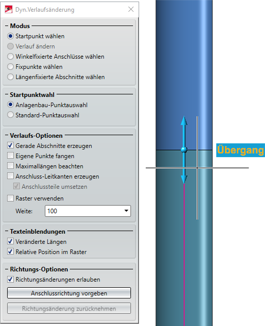 Die Verlaufsänderung unterstützt die Nutzung eines Rasters. Der Ursprung des Rasters fällt dabei immer auf den zu verschiebenden Punkt. Die Ausrichtung ist immer so gewählt, dass eine der Achsen des Rasters in Anschlussrichtung zeigt und eine zweite in der X-Y-Ebene des aktiven Koordinatensystems liegt. Das Raster wird durch gepunktete Hilfslinien visualisiert. Die Rasterschrittweite ist ISD-seitig auf 100 voreingestellt. siehe Abschnitt Raster verwenden |