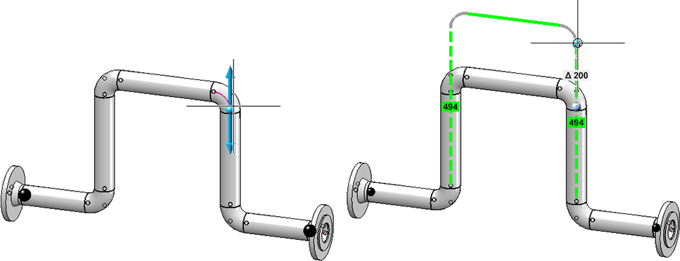 Mit der Verlaufsänderung ist es nicht nur möglich, die Längen vorhandener Rohre zu verändern, sondern es lassen sich auch zusätzliche gerade Abschnitte erzeugen. Ein häufiger Anwendungsfall ist die Erhöhung des Abstandes zwischen zwei Teilen, z. B. zwischen einem Bogen und einem Flansch siehe Abschnitt Gerade Abschnitte erzeugen |