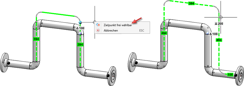 Es kommt vor, dass die in einer Rohrleitung vorhandenen geraden Abschnitte nicht ausreichen, um den zu verschiebenden Punkt bis zum Zielpunkt zu bewegen.In solchen Fällen kann mit Anschluss-Leitkanten gearbeitet werden. Dazu muss die Checkbox aktiviert werden. siehe Abschnitt Anschluss-Leitkanten |