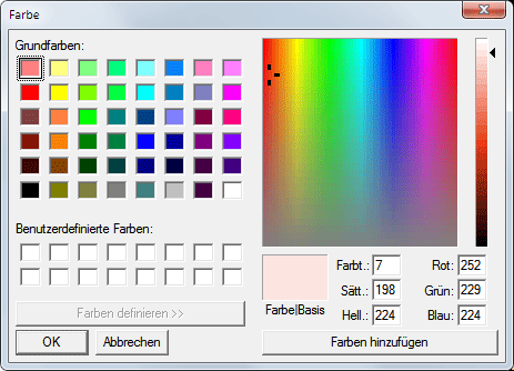 aktivieren. Neben den Grundfarben können Sie hier benutzerdefinierte Farben verwenden, indem Sie rechts im Fenster die Farbe einstellen und diese mit der Funktion Farben hinzufügen als benutzerdefiniert übernehmen. Wählen oder definieren Sie die gewünschte Farbe, und schließen Sie das Fenster mit OK ab.