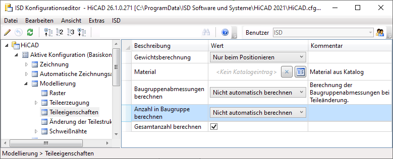 Der ermittelte Wert wird dem Teileattribut Gesamtanzahl (%06) zugeordnet und beim Bearbeiten der Teile, z.B. beim Löschen oder Wiederholen von Teilen, automatisch aktualisiert. In sehr großen Konstruktionen kann diese Aktualisierung die Performance negativ beeinflussen, beispielsweise beim Löschen von Baugruppen. In solchen Fällen kann die Checkbox deaktiviert werden. Ist dies der Fall, dann wird - nach einem Neustart von HiCAD - beim nächsten Laden der Konstruktion, das Attribut Gesamtanzahl' der betroffenen Teile gelöscht statt berechnet.