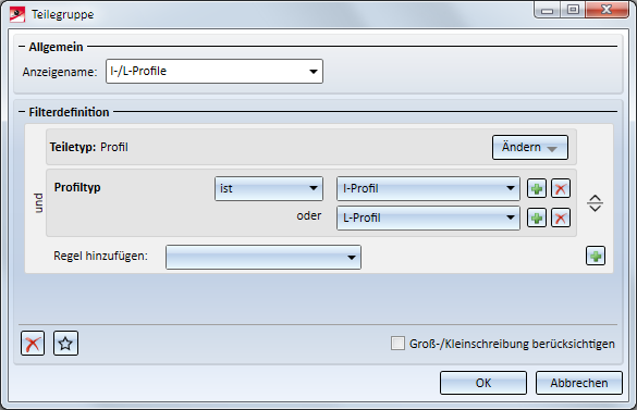 - Da diese Teilegruppe nur für I- und L-Profile gelten soll, muss hier eine Regel hinzugefügt werden. Wählen Sie in der Listbox unter Eigenschaften den Eintrag Profiltyp. I-Profil ist dann voreingestellt.