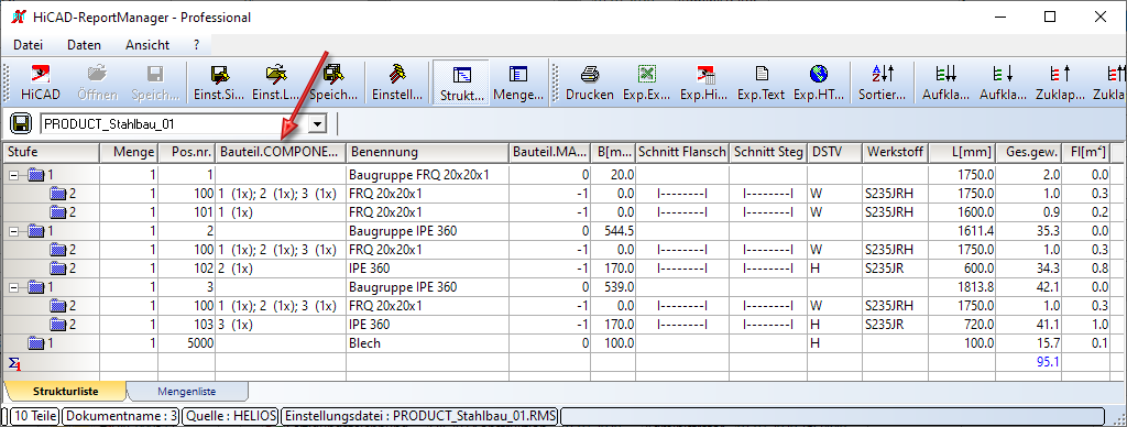 HiCAD Konstruktionen im Stahlbau werden häufig in Bauabschnitte, z. B. Rahmen, Bühne, Stütze, Bühnenträger etc. strukturiert. Diese Bauabschnitte sind in der Regel nicht stücklistenrelavante Strukturbaugruppen. Ist diesen Bauabschnitten/Strukturbaugruppen die Verwendungsart Bauabschnitt oder Fertigungsabschnitt zugeordnet, dann werden diese auch dann in die HELiOS Produktstruktur übertragen, wenn sie nicht stücklistenrelevant sind. Dazu muss aber der Parameter Nicht stücklistenrelevante Bauabschnitte übertragen auf Ja stehen. Darüber hinaus muss der Artikelstamm dieser Baugruppen manuell angelegt werden!,