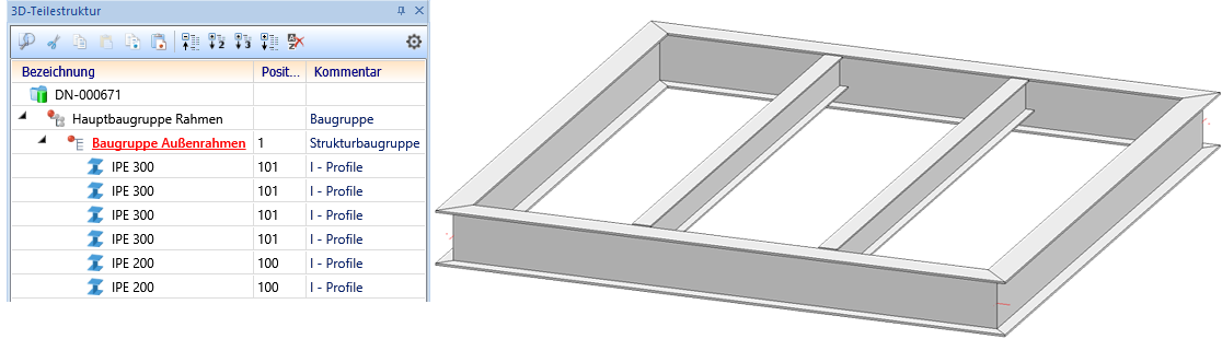 Jetzt werden die beiden Verstrebungen (IPE200) zu einer Baugruppe zusammengefasst, die in der Hierarchie um eine Stufe nach oben verschoben wird. Das heißt, beide Baugruppen liegen nun auf derselben Stufe. Die Zeichnung wird positioniert und gespeichert. Dann wird die ontagezeichnung mit der Funktion Neue Ansichtsgruppe über aktive Baugruppe(n)aktualisiert.