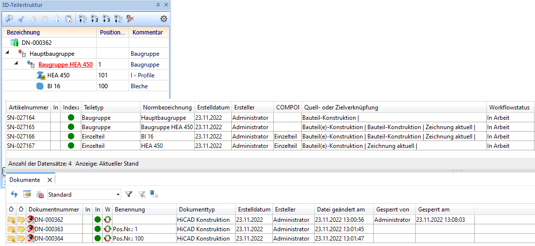 Artikelstämme und verknüpfte Zeichnungen der aktiven Baugruppe incl. Nebenteilen ableiten |