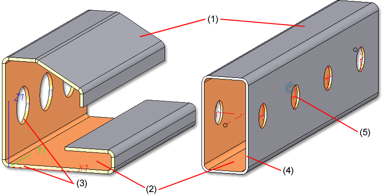 (1) Beschichtung (Außenseite), (2) Rückseite/Innenseite abweichend, (3) Stirnflächen und Bearbeitungen beim Kantblech wie Rückseite beschichten, (4) Stirnflächen beim Hohlprofil nicht beschichten, (5) Bearbeitungen (bei Hohlprofilen) wie Innenseite beschichten