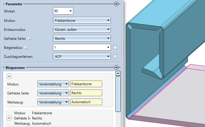 In der aufgeklappten Tabelle können Sie bei Modus zwischen Biegezone und Fräskantzone wählen. Je nach eingestelltem Modus können Sie dann den Wert des Biegeradius oder der gefrästen Seite ändern.
