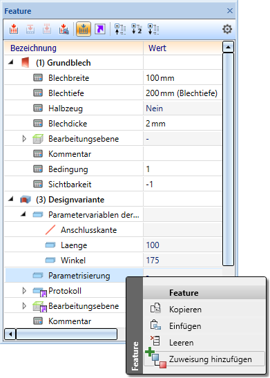 - Klicken Sie im ersten Feature Designvariante mit der RMT auf Parametrisierung und dann auf die Funktion Zuweisung hinzufügen.
