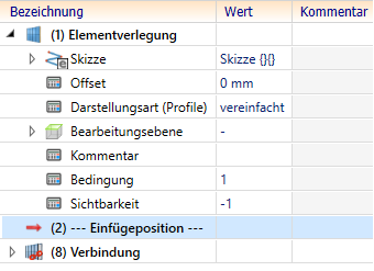 Legt fest, ob die Einträge des Feature-Protokolls in mehreren Spalten aufgeteilt oder in eine einzelne Spalte zusammengefasst angezeigt werden sollen. Letzteres entspricht der Anzeige des Feature-Protokolls in HiCAD-Versionen vor 2020 SP2.