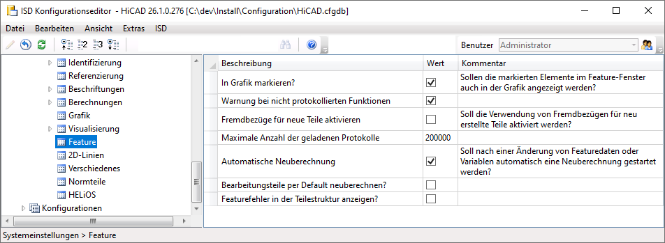 Die Einstellungen finden Sie links in der Baumstruktur unter HiCAD > Aktive Konfiguration (Basiskonfiguration) > Systemeinstellungen > Feature.