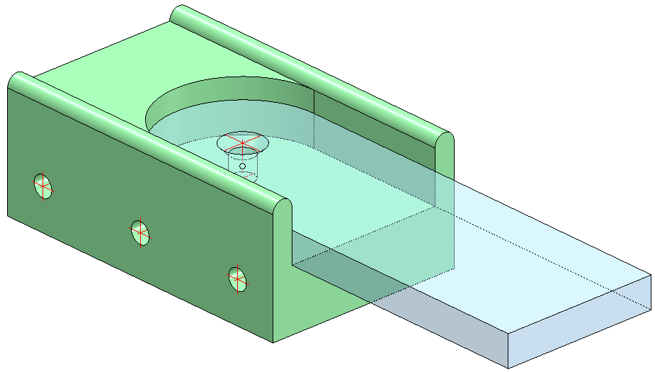 Wenn die Verwendung von Fremdbezügen deaktiviert wurde, stehen die jeweiligen Funktionen ("Ausnehmen bis Fläche", zum Beispiel) auch weiterhin zur Verfügung. Allerdings werden dann Änderungen am Fremdbezug nicht verfolgt. Im obigen Beispiel mit der Halterung und der Lasche würde dies bedeuten, dass die Ausnehmung am Anfang bis zur Fläche an der Lasche erzeugt wird, dann jedoch bei Änderungen an der Lasche nicht mehr aktualisiert wird. Da der Bezug dennoch im Featureprotokoll gespeichert wird, können Sie später jedoch weiterhin die Verwendung von Fremdbezügen für dieses Teil wieder aktivieren.