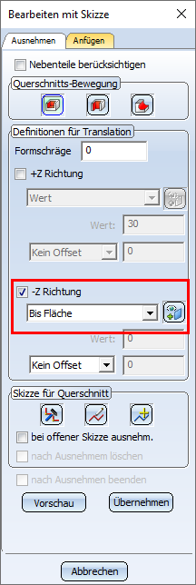 In der grünen Halterung wird über die Funktion Teil ausnehmen, mit Translation eine Ausnehmung für die Aufnahme der blauen Lasche (die hier zur besseren Sichtbarkeit transparent angezeigt wird) erzeugt. Diese Ausnehmung soll sich dabei an die Lage der Lasche anpassen. Daher wurde für die Tiefe der Ausnehmung die Option Bis Fläche gewählt und die Fläche auf der Unterseite der Lasche ausgewählt.