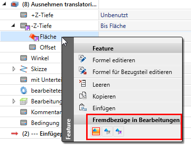 Fremdbezüge werden im Featureprotokoll besonders gekennzeichnet. Beinhaltet ein Featureparameter einen Fremdbezug, der verwendet wird, wird dies durch ein