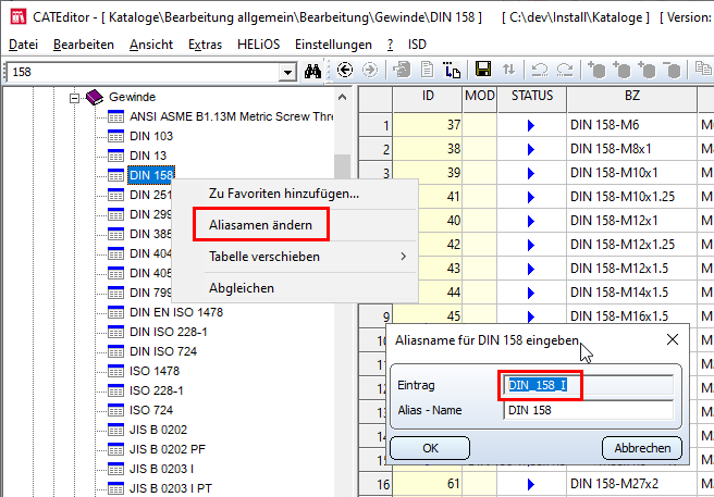 Der erste Parameter ist dabei der interne Name der zu durchsuchenden Tabelle im Katalog. Diesen erhalten Sie, indem Sie im Katalogeditor die gewünschte Tabelle mit der rechten Maustaste anklicken und im Kontextmenü den Eintrag Aliasnamen ändern auswählen. Der interne Name der Tabelle steht im dann erscheinenden Dialogfenster im Feld Eintrag. Diesen Dialog können Sie anschließend über einen Klick auf die Schaltfläche Abbrechen wieder schließen.