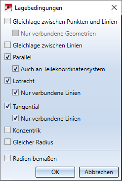 Diese Funktion erstellt automatisch Lagebedingungen zwischen geeigneten Elementen eines Kantenzuges. Nach Aktivieren der Funktion haben Sie die Wahl, welche Lagebedingungen gesucht werden sollen: