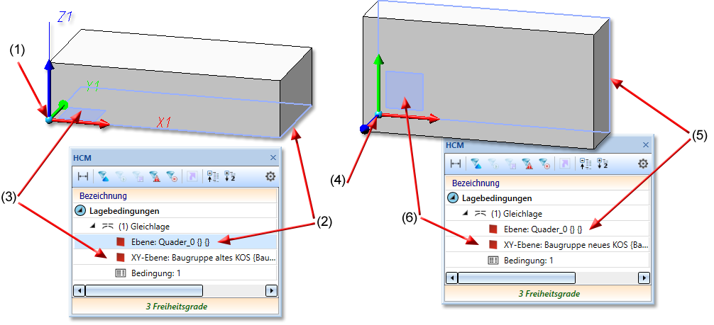(1) Koordinatensystem der Baugruppe, (2) erste Ebene für die Gleichlage ist die untere Fläche des Quaders, (3) zweite Ebene der Gleichlage ist die XY-Ebene des Koordinatensystems