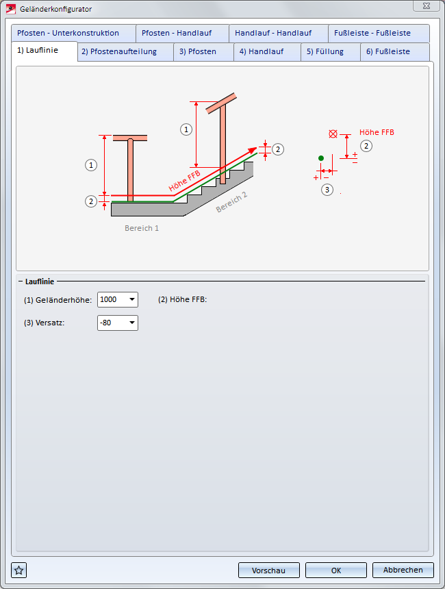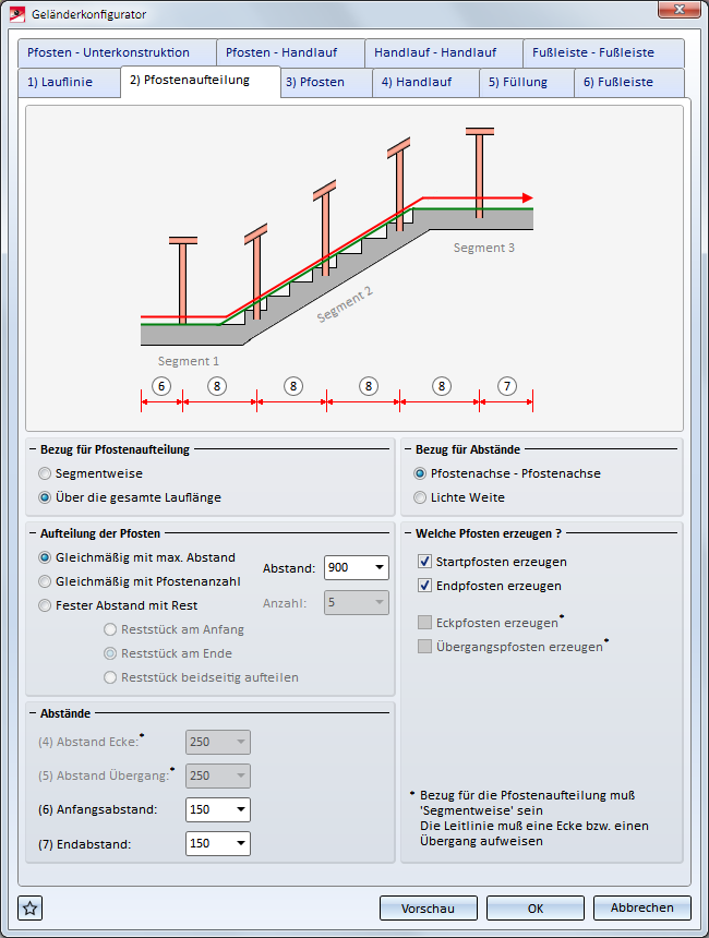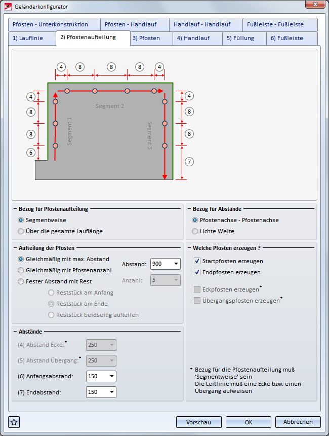 Sie beenden die Identifizierung der Kanten mit der mittleren Maustaste und aktivieren so automatisch das Dialogfenster Geländerkonfigurator. Die Bedienung des Dialogfensters erfolgt im wesentlichen analog zur Funktion Geländerkonfigurator (entlang Profilen), nur die Registerkarten Lauflinie und Pfostenaufteilung unterscheiden sich hinsichtlich der Erklärungsgrafiken.