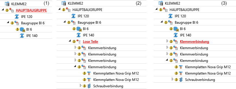 (1) Ausgangsstruktur, (2) Einbau mit Option Lose Teile, (3) Einbau mit Option Baugruppe