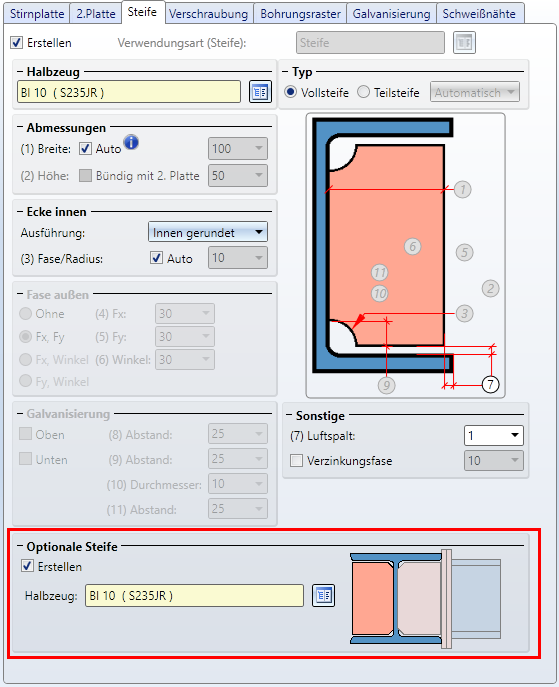 Beim Anschluss Profil an Steg mit 2 Blechen + Steife (1211) lässt sich jetzt optional eine zweite Steife einbauen - fluchtend zur ersten Steife.