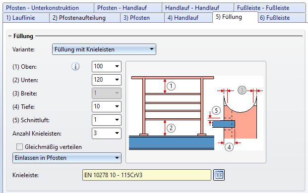 Knieleisten eines Geländers können jetzt auch in den Pfosten eindringen. Dazu steht auf der Registerkarte Füllungen für Füllungen mit Knieleisten die neue Variante Einlassen in Pfosten zur Verfügung.