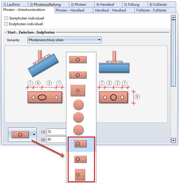 Beim Geländerkonfigurator stehen auf der Registerkarte Pfosten-Unterkonstruktion neue Fußplattentypen zur Verfügung:
