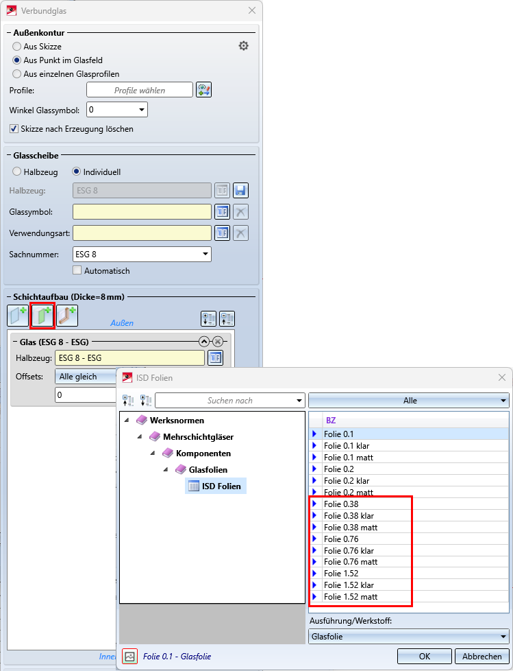 stellt ab SP2 beim Einbau individueller Glasscheiben mit Folienschichten zusätzliche Folienstärken zur Verfügung - 0.38, 0.76 und 1.52, jeweils in den Ausführungen matt und klar.