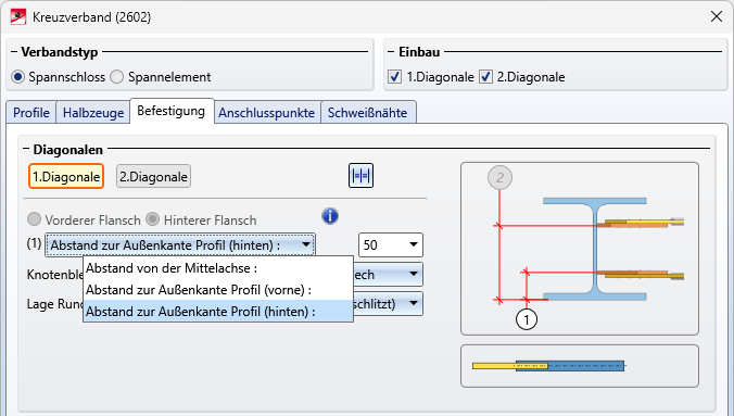 Der Einbau der Kreuzverbände 2601 und 2602 kann ab HiCAD 2023 SP1 auch mit Angabe des Abstands der Knotenbleche vom vorderen oder hinteren Flansch erfolgen. Dies findet beispielsweise Verwendung im Hallenbau. Dort kann es vorkommen, dass ein Kreuzverband zwischen zwei verschieden großen Profilen verlegt werden soll, deren obere Flansche auf gleicher Ebene liegen.