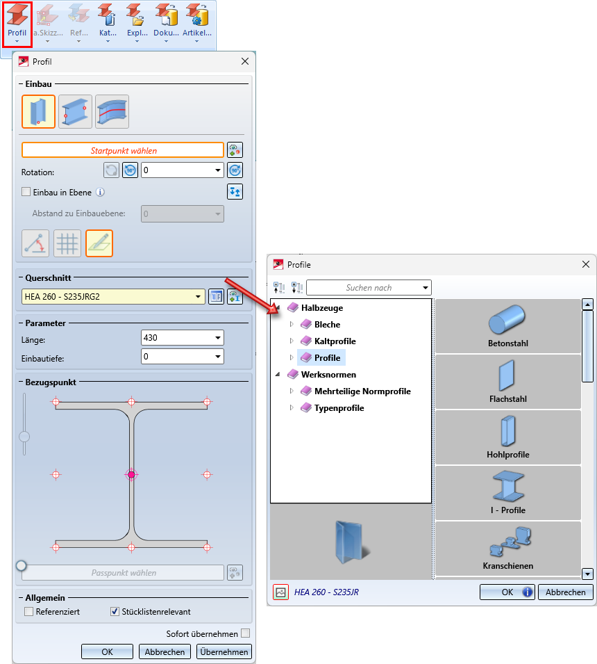 lassen sich jetzt nicht nur 3D-Standardprofile sondern auch mehrteilige Normprofile, Typenprofile und Profilbleche einbauen. Die Auswahl erfolgt in den Katalogen