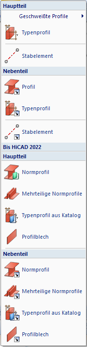 Die bisherigen Funktionen für den Profileinbau (vor HiCAD 2023), die jetzt in die neue Funktionalität integriert sind, stehen im Menü unter Bis HiCAD 2022 weiterhin zur Verfügung.