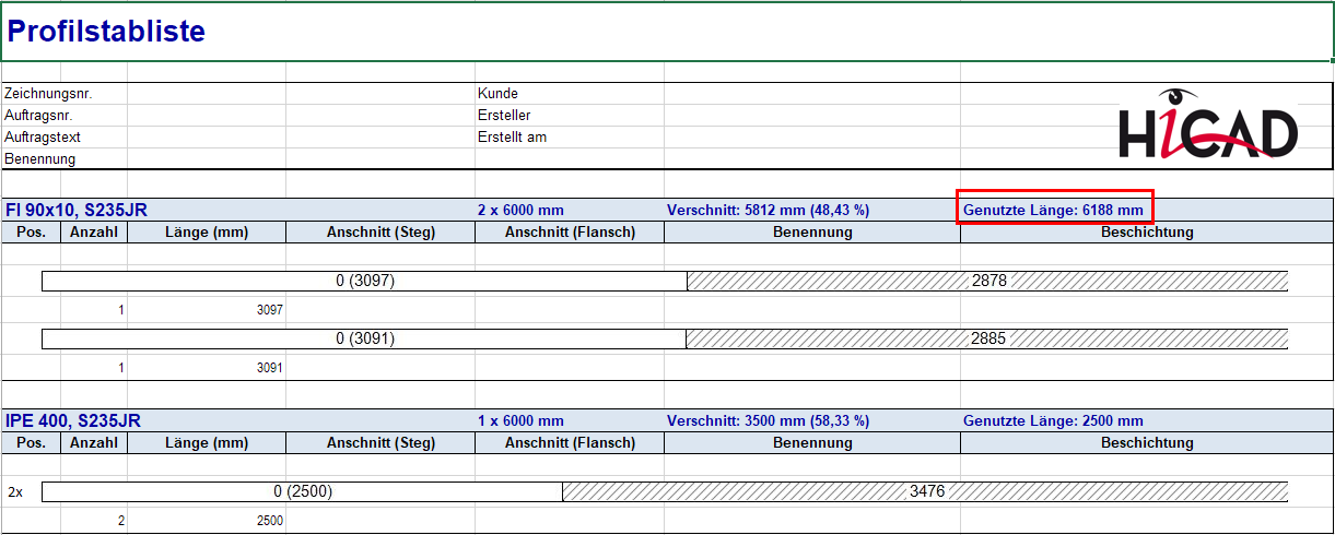 Ab SP2 wird in der Excel Profilstabliste neben dem Verschnitt auch die tatsächlich genutzte Länge ausgegeben. Dazu ist die Stücklistenvorlage für den Stahlbau entsprechend angepasst worden. (siehe Report Manager - Was ist neu?).