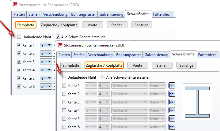 Für Steifen werden in der Praxis häufig umlaufende Nähte verwendet, was insbesondere auch die Zeichnung deutlich einfacher macht. Aus diesem Grund sind die entsprechenden Registerkarten der folgenden Designvarianten erweitert worden: