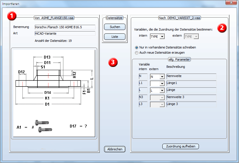 - Das Dialogfenster Importieren wird angezeigt. Das Dialogfenster enthält, wie das Hauptfenster des Varianteneditors, ein Anzeigefenster (1) und ein Tabellenfenster (2). Unter (3) finden Sie die Funktionen zur Auswahl der zu importierenden Datensätze.