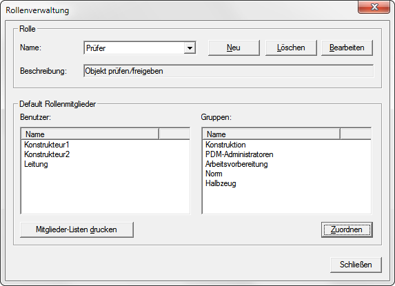 Der Button Mitglieder-Listen drucken öffnet die Auflistung aller, der aktiven Rolle zugeordneten, Benutzer und Gruppen im HiCAD Report-Manager.