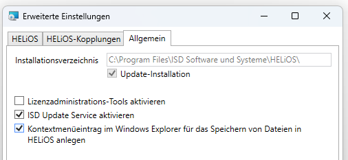 Zusätzlich ist es auch möglich, diese Option bei der (Update-)Installation von HELiOS zu de-/aktivieren. Hierfür muss lediglich im Reiter Allgemein des Installationsschritt-Dialogs Erweiterte Einstellungen die Checkbox Kontextmenüeintrag im Windows Explorer für das Speichern von Dateien in HELiOS anlegen gesetzt bzw. entfernt werden.