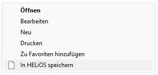 Oben im Fenster können Sie unter "Speichern in HELiOS" im Datei-Explorer über Hinzufügen einen Menüpunkt in das Kontextmenü ihres Windows-Explorers hinzufügen (Sie benötigen hierfür Admin-Rechte). Diese Funktion kann nützlich sein, wenn die Übernahme einer Datei durch Abbrechen des Dokumentendialogs oder aufgrund eines Fehlers bei Übernahme ohne Dialog nicht erfolgt ist. Um die Datei erneut zu übernehmen, steht dafür dann der RMT-Menüpunkt In HELiOS speichern im Windows- Dateiexplorer zur Verfügung, den Sie im Übernahme-Verzeichnis ausführen können.