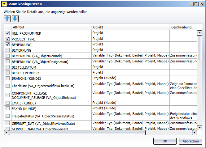 Mit den Pfeiltasten können Sie die Position des markierten Attributs ändern, und es weiter nach oben oder unten klicken. Die Reihenfolge von oben nach unten in der Auswahl-Liste entspricht dann der Anzeige (von links nach rechts durch Kommas getrennt) der Projekt-Attribute im Projektexplorer.