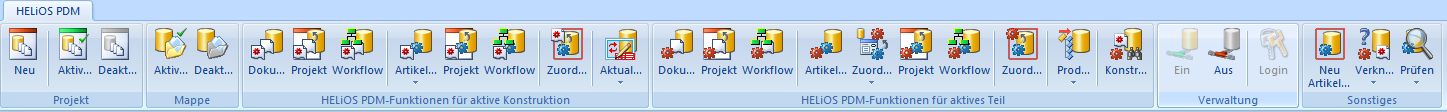 In der Registerkarte HELiOS PDM der HiCAD Ribbon-Leiste finden Sie folgende Funktionsgruppen: