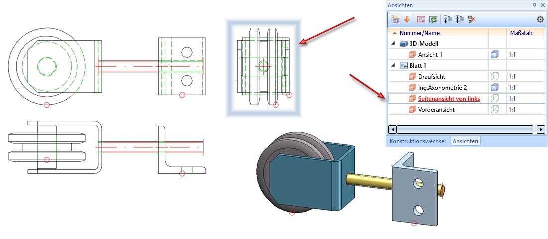 HiCAD ermöglicht das Anlegen von bis zu 9998 Ansichten einer Konstruktion, von denen jedoch immer nur eine Ansicht aktiv sein kann. Die Bearbeitungs- und Darstellungsfunktionen für Ansichten beziehen sich immer auf die aktive Ansicht oder - je nach Funktion - auf eine Mehrfachauswahl von Ansichten, die sogenannte Ansichtsliste.