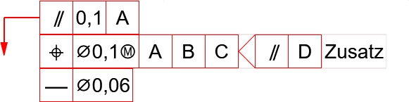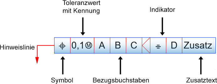 Die geometrischen Toleranzen werden in einem rechteckigen Rahmen - dem Toleranzrahmen - angegeben. Dieser besteht aus ein bis fünf Kästchen, die das Symbol für die zu tolerierende Eigenschaft, den Toleranzwert und den Buchstaben für Bezugselemente etc. enthalten können. Darüber hinaus lassen sich Indikatoren und Zusatztexte angeben.