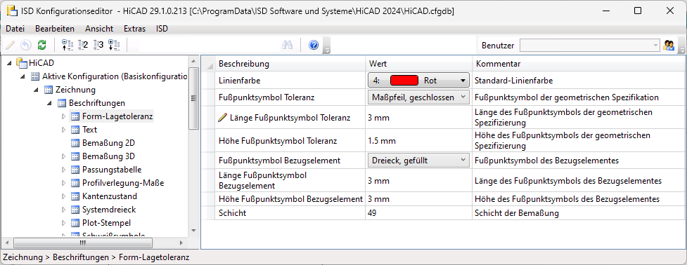 - Verschiedene Parameter für Form-/Lagetoleranzen (ab HiCAD 2023 SP2) lassen sich im Konfigurationsmanagement voreinstellen und zwar unter Zeichnung > Beschriftungen > Form-/Lagetoleranz.