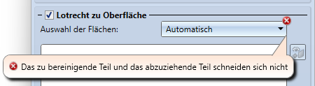 Hier werden alle Flächen des zu bearbeitenden Teils auf Durchdringungen durch die Kollisionsteile überprüft. Alle Flächen mit Durchdringungen werden in die Flächenauswahl übernommen. |
