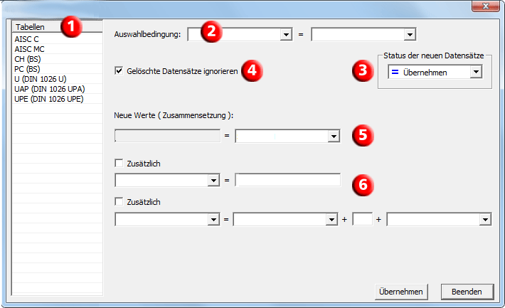 Mit dieser Funktion lassen sich in einem Schritt in allen oder mehreren Tabellen eines Kataloges ganze Blöcke von Datensätzen kopieren und automatisch mit einer bestimmten (neuen) Ausprägung versehen. Beachten Sie dabei bitte, dass dies für Textspalten möglich ist. Ein wichtiger Anwendungsfall ist es, Datensätze mit einem bestimmten Material zu kopieren und diesen Kopien automatisch eine bestimmte Oberflächenart zuzuordnen.