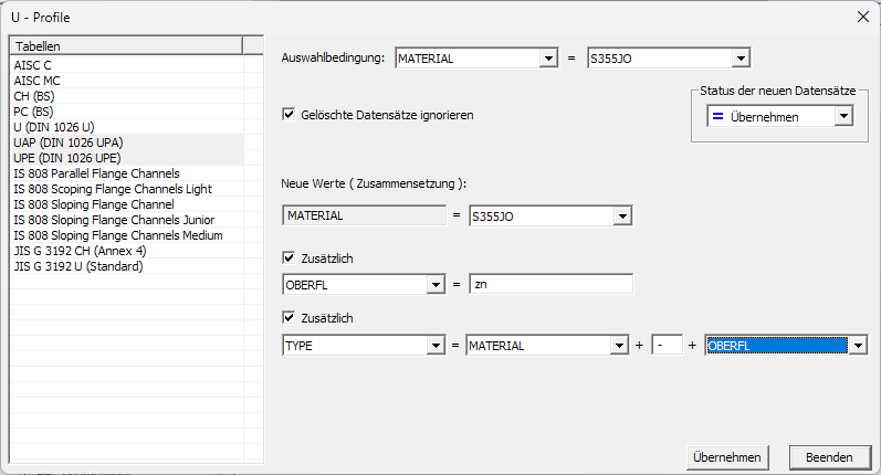 Im Katalog U-Profile sollen die Tabellen UAP und IPE wie folgt bearbeitet werden. Alle Datensätze mit dem Material S355JO sollen kopiert werden. Dabei soll den Kopien automatisch die Oberfläche zn (verzinkt) zugeordnet werden.