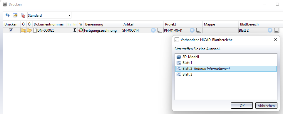Auch neuere SZA-Dokumente, deren Blattstruktur noch nicht nach HELiOS übertragen wurde, lassen sich prinzipiell drucken. Das Drucken verhält sich hier genauso wie bei alten HiCAD2-Dateien. Ein sinnvoller Druck ist damit an der Stelle nicht möglich. Gehen Sie also sicher, vorm Drucken die Blattstruktur durch Speichern von HiCAD nach HELiOS übergeben zu haben.