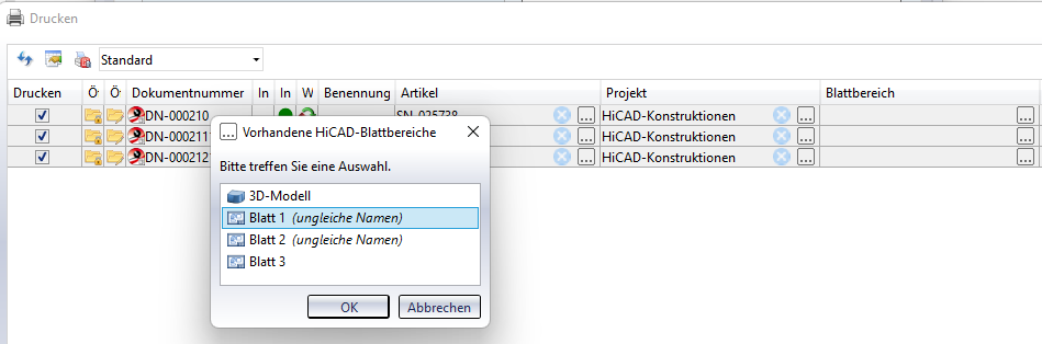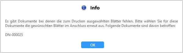 Wenn Sie dabei Blätter auswählen sollten, die nicht bei allen markierten Dokumenten verfügbar sind, kommt erscheint eine Meldung dazu und die entsprechenden Blätter werden zum Drucken abgewählt.