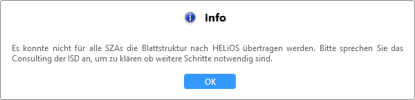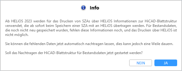 Wenn HiCAD mit HELiOS nach der Update-Installation gestartet wird, bekommen Sie eine Meldung bzgl. des Nachtragens der Blattstruktur-Daten.