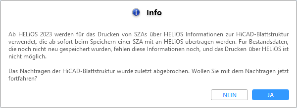 Beachten Sie in diesem Zusammenhang, dass bei einer Update-Installtion auf HELiOS 2023 in Kombination mit einer älteren HiCAD-Version das Drucken von SZA-Dateien über HELiOS aufgrund dieser Umstellung nicht mehr möglich ist.