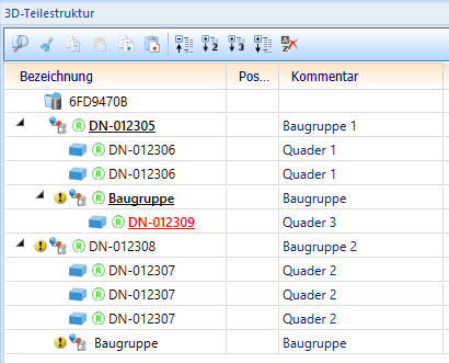 Die dargestellte Dokumentstruktur enthält den zuletzt gespeicherten Stand der HiCAD-Datei (SZA / KRA). Da sich SZAs / KRAs bei Änderungen untergeordneter Bauteile erst beim Laden aktualisieren, bedeutet das, dass die in HELiOS gespeicherte Dokumentstruktur von der in der SZA / KRA gespeicherten Bauteilstruktur abweichen kann.